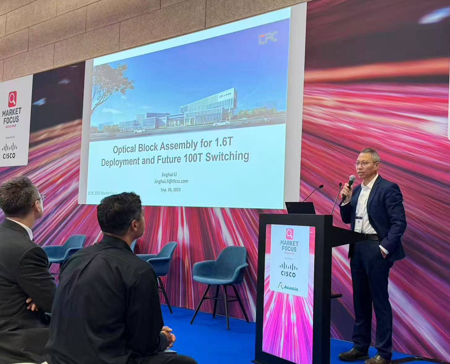 At the ECOC 2025 Market Focus Forum, Dr. Li Jinghui, General Manager of TFC USA and Singapore, was invited to participate in the panel discussion on "1.6T Deployment Status and Outlook for 100T Switching" and delivered a speech titled "Optical Block Assembly for 1.6T Deployment and Future 100T Switching".