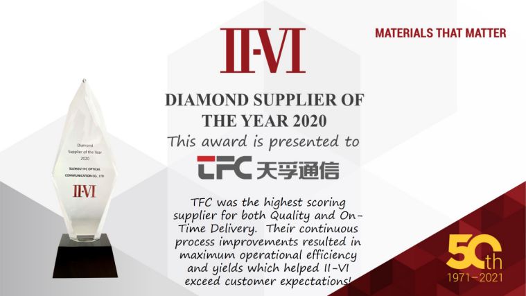 Jan. 29, 2021--Suzhou TFC Communication Co., Ltd, a global leader in vertical integrated optical device manufacturing and service provider, today announced that it has received the Diamond Supplier of the Year 2020 award from II-VI Incorporated.