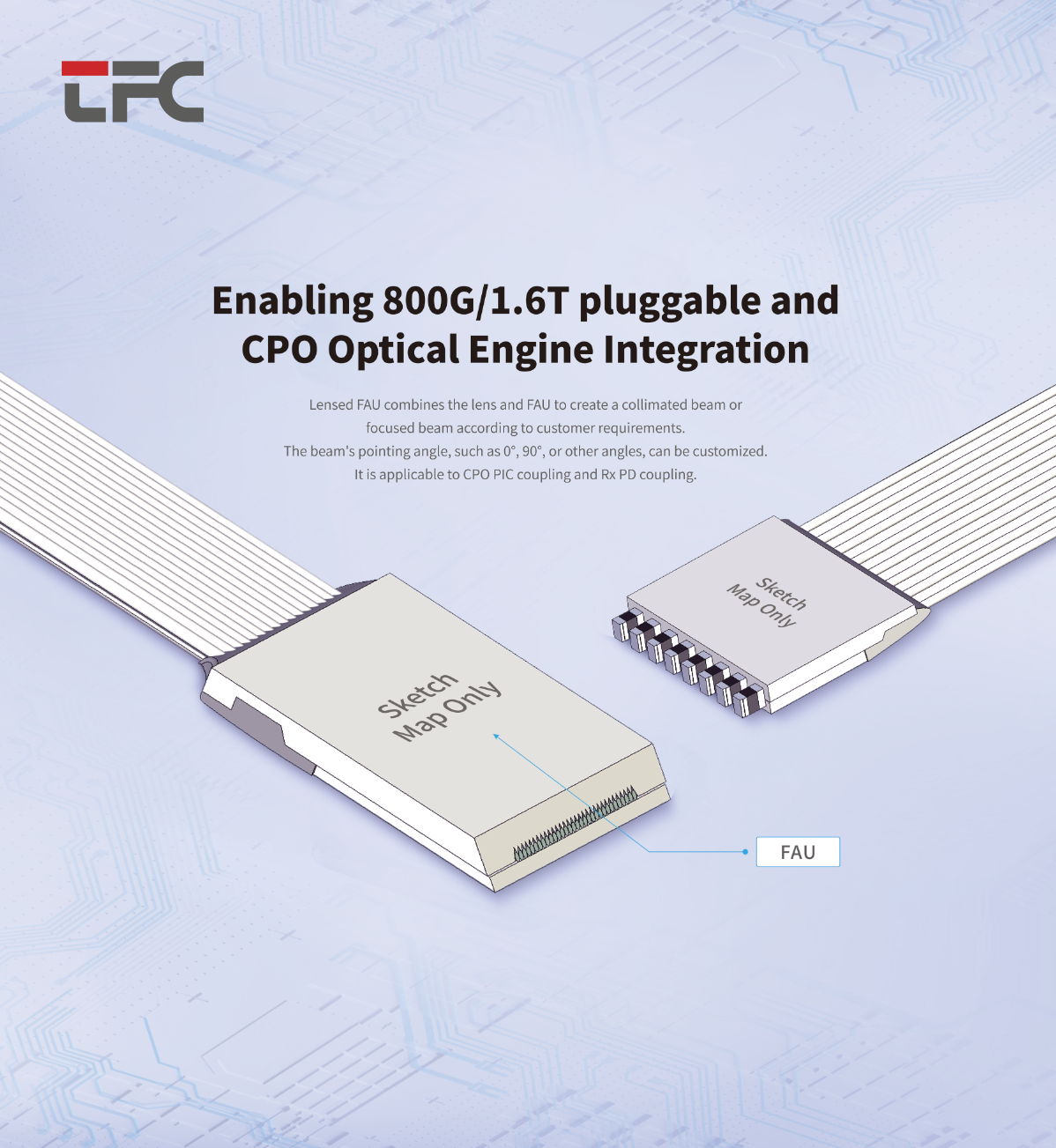 TFC's Lensed FAU is a key component of high-speed optical engines. Integrating a lens with a Fiber Array Unit (FAU), it can, according to customer's requirements, generate parallel or focused light beams at customizable angles of 0°, 90°, and more. Highly versatile, this product finds application in various optical communication technologies such as Co-Packaged Optics (CPO), Photonic Integrated Circuit (PIC) coupling, and receiving-end Photonic Detector (Rx PD) coupling. It features high coupling efficiency, low loss, and high-density fiber arrangements. It is easy to assemble and cost-effective, being widely used in AI and data center environments.