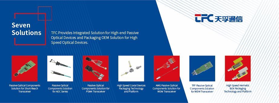 此外,展會上,天孚通信重點展示了OSA OEM產品、Isolator、Fiber Array和MPO、Lens Array等十大系列產品,還重點展示SR系列、AOC系列、PSM4系列、AWG WDM系列、TFF WDM系列五大高端無源器件解決方案和高速率同軸器件封裝、高速率BOX器件封裝兩大高速光器件封裝OEM方案。